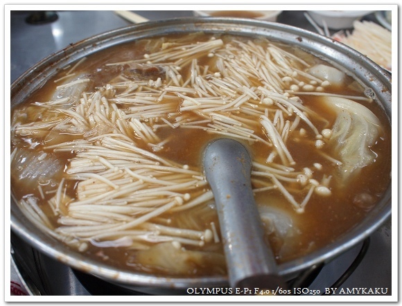 等待飯友們到齊的時間裡,老板娘(據說是韓國人?)不時過來招呼我們,介紹菜色之餘還不忘交代店員先上小菜以免我們無聊。全員到齊後才敲定這天的菜色,五人成行的我們點了一鍋紅通通辣雞(NT$299*2)、一鍋甘醬燒牛(NT$399*2)、一份海鮮煎餅NT$220及一瓶馬格利濁酒。