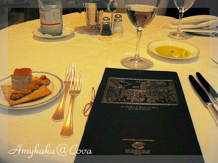 服務生送上菜單後,在不充足的光源下,我們花了一些時間研究,菜單的內容全篇都是英文及義大利文,看不懂義大利文的菜名,愛咪只能從英文說明中的食材來拼湊料理的味道,可能是我們面有難色的神情太過明顯,後來出現一位講中文的服務生主動跟我們說明菜色。