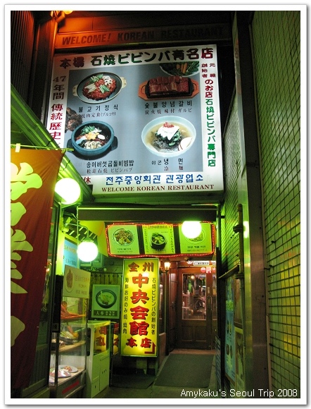今天就來上個韓國料理吧!要介紹的是坐落明洞巷弄內的全州中央會館,雖然它隱身小巷內,但每回出入明洞時都很難不注意到它,因為餐廳所在的巷子口就有一間UNIQLO,營業時間內都有一個穿韓服戴斗笠的老翁當作活動招牌,站在巷口招攬客人…