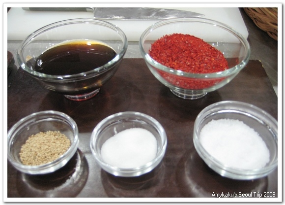 6) 在大盆子內加入辣椒粉、魚露、鹽巴、砂糖(可用蘋果泥、梨子泥取代)、芝麻。