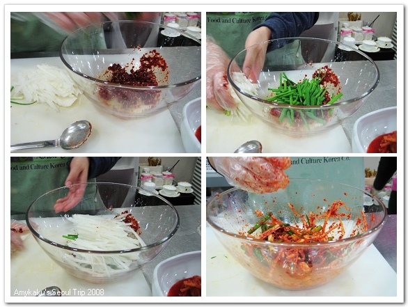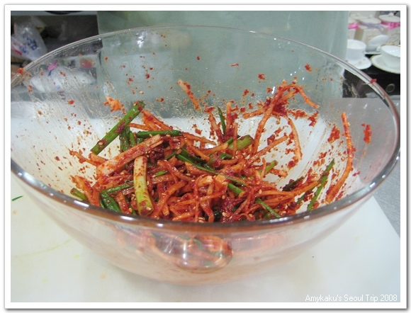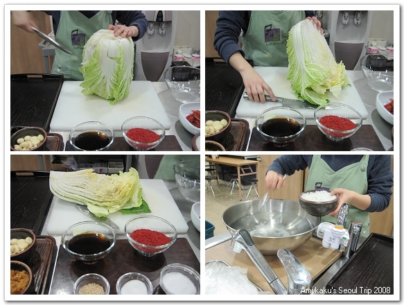 泡菜製作初體驗就此展開,Ms.Jung先把製作泡菜需要的材料、調味料解釋過。也是她告訴我這個時候是一年中做泡菜的最佳時機,韓國人會把泡菜一口氣做好後儲存起來,古時候是裝在大甕裡埋在地底下保存,現在有些講求古法製作的餐廳也還維持這種方式。但對於沒地可挖的現代人來說,”泡菜冰箱”是科技的產物,Ms.Jung說她家裡就有一台,父母最近也為了製作一整年度的泡菜大費周章的準備著。