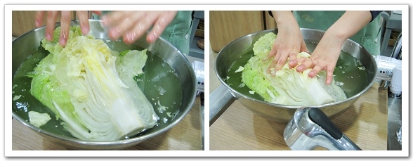 2) 攪拌至粗鹽完全溶解後,將大白菜完全浸入鹽水中再拿起瀝乾。